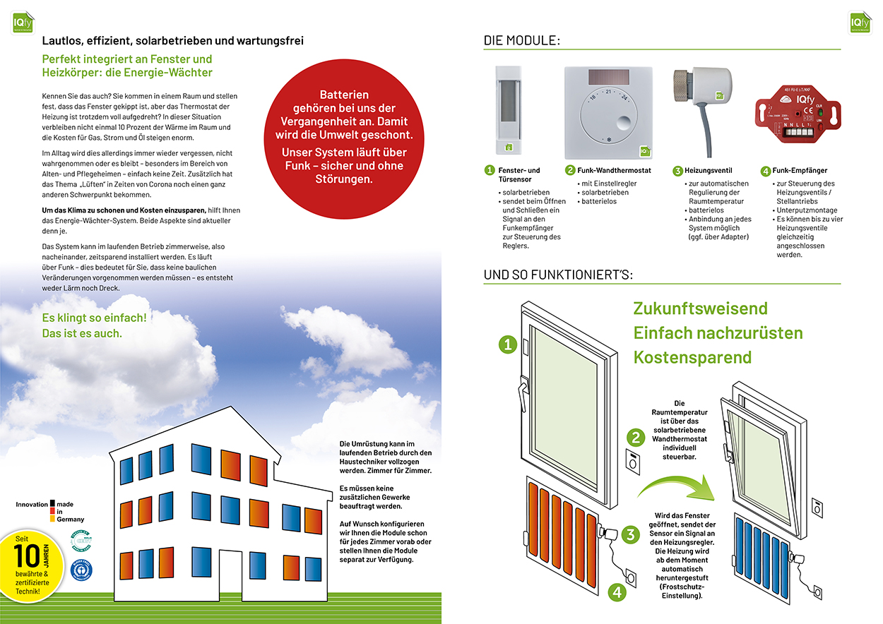 Die IQfy GmbH hat eine Mission. Das Unternehmen aus Meinerzhagen hat es sich zur Aufgabe gemacht, den Alltag in Gebäuden für Menschen leichter und sicherer, für Unternehmen wirtschaftlicher und planbarer zu machen. Die Lösung dafür: anwesenheitsabhängige Steuerung über Sensoren und Funknetze. Zusätzlich bietet das Unternehmen unter der Produktlinie IQcare Alarm- und Notrufsysteme für Sicherheit und Effizienz in der Pflege an. apfel.media wurde beauftragt, das bestehende CI in Werbemitteln umzusetzen sowie redaktionelle Beiträge zu erstellen.